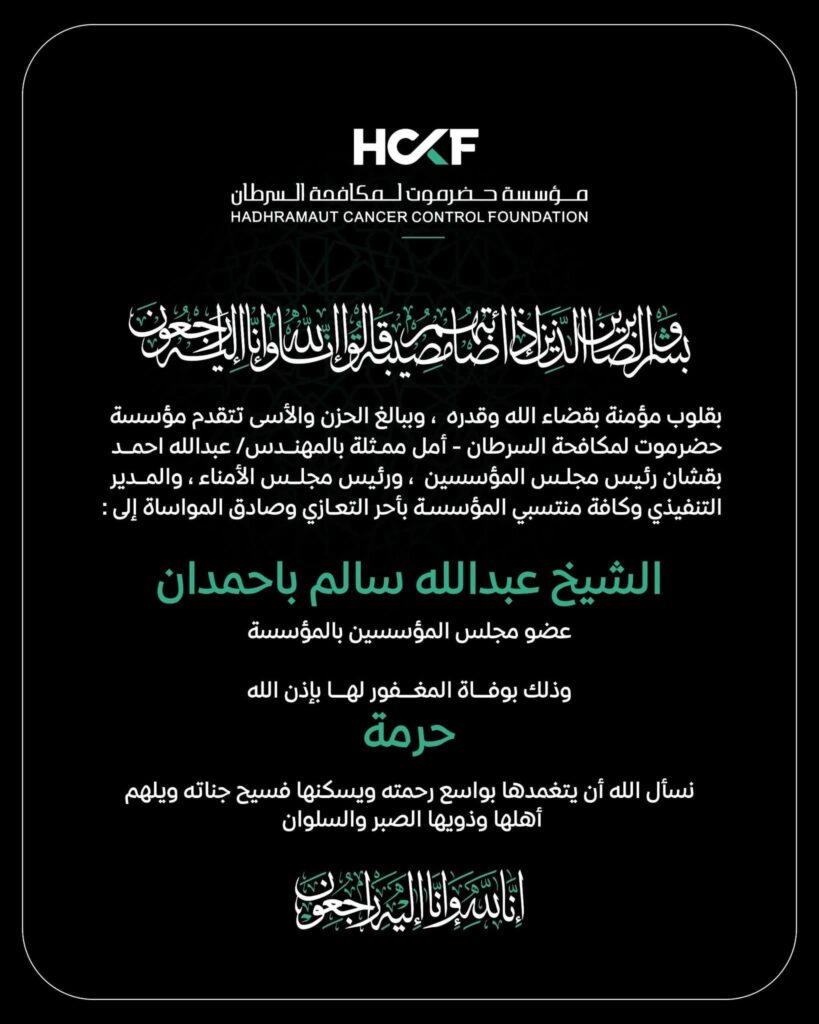 5 سبتمبر 2025م بقلوب مؤمنة بقضاء الله وقدره، وببالغ الحزن والأسى، تتقدم مؤسسة حضرموت لمكافحة السرطان – أمل، ممثلة بالمهندس