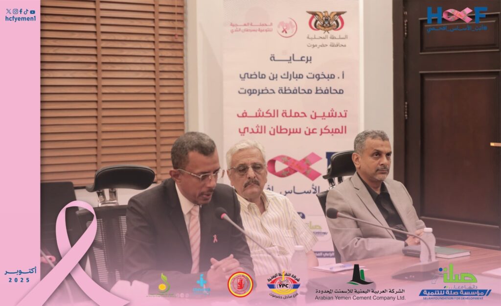 برعاية محافظ محافظة حضرموت الأستاذ مبخوت مبارك بن ماضي، دشّنت مؤسسة حضرموت لمكافحة السرطان (أمل) اليوم الأربعاء فعاليات “الشهر الوردي” (شهر أكتوبر للتوعية بسرطان الثدي)، تحت شعار: “أنتِ الأساس.. افحصي”، وذلك ضمن الحملة العربية الأولى للتوعية بسرطان الثدي التي ينظمها الاتحاد العربي لمكافحة السرطان (قيد التأسيس)، وتُعد المؤسسة عضواً مؤسساً فيه.