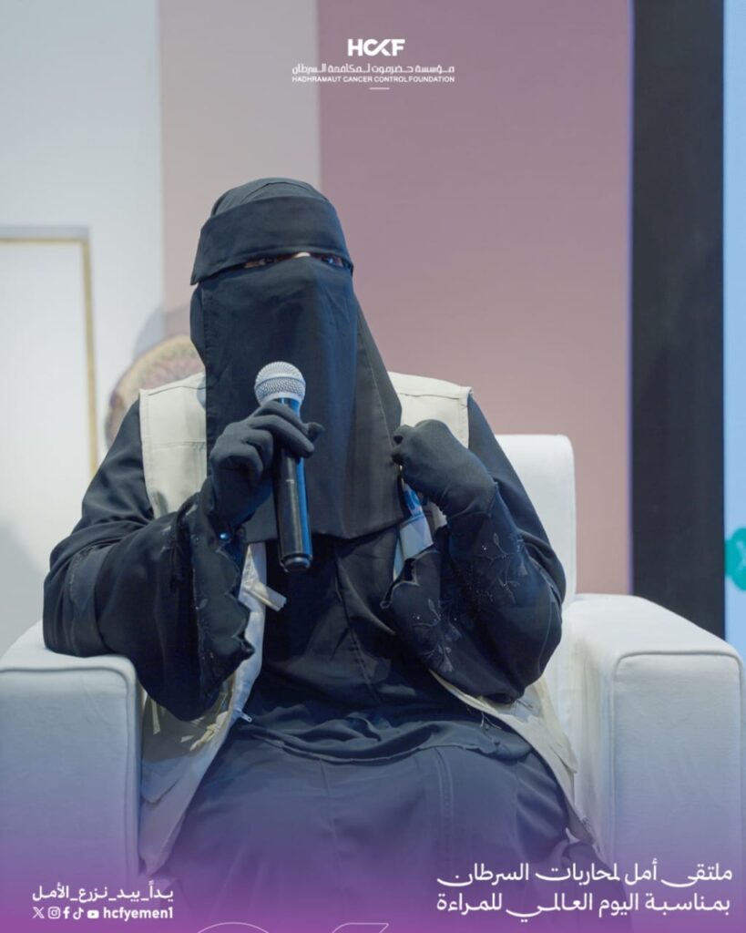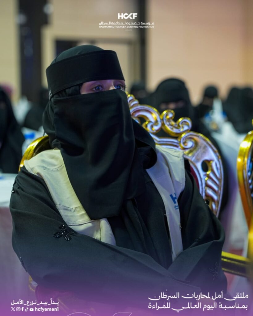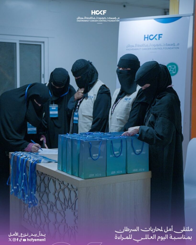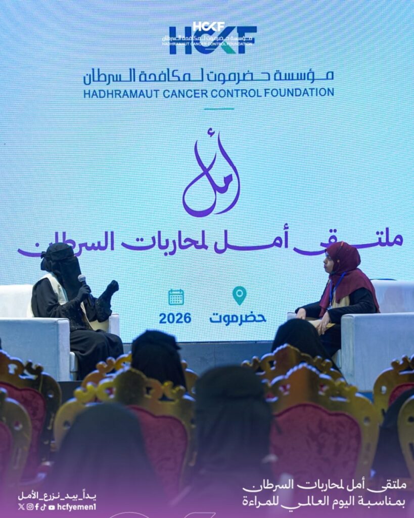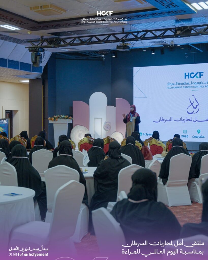 مؤسسة حضرموت لمكافحة السرطان تقيم ملتقى أمل دعماً لمحاربات السرطان تزامناً مع اليوم العالمي للمرأةإعلام المؤسسة |8مارس2026|المكلاأقامت مؤسسة حضرموت لمكافحة السرطان (أمل) ملتقى توعوياً بعنوان “ملتقى أمل”، تزامناً مع اليوم العالمي للمرأة، وذلك في إطار جهودها المستمرة لدعم محاربات السرطان وتعزيز روح الأمل لديهن.وشهد الملتقى حضور عدد من المتعافيات من المرض إلى جانب المحاربات اللواتي يواصلن رحلة العلاج، في أجواء إنسانية ملهمة جسّدت معاني الصبر والقوة والتكاتف. وتضمن البرنامج عدداً من الفقرات التوعوية والتفاعلية، من أبرزها تقديم نصائح غذائية تسهم في تعزيز صحة الجسد خلال رحلة العلاج، إضافة إلى جلسات دعم نفسي هدفت إلى تمكين الإرادة ورفع المعنويات لدى المشاركات.كما تخلل الملتقى عرض قصص نجاح وتجارب واقعية روتها متعافيات من السرطان، قدمن خلالها رسائل أمل وإلهام للحاضرات، مؤكدات أن الإرادة والصبر يشكلان طريقاً نحو التعافي واستعادة الحياة.وأكدت المؤسسة أن ملتقى أمل يأتي ضمن برامجها الهادفة إلى دعم مرضى السرطان نفسياً ومعنوياً، وتعزيز الوعي المجتمعي بأهمية الوقوف إلى جانب المرضى، مشيرة إلى أن مثل هذه اللقاءات تسهم في بث روح التفاؤل وترسيخ رسالة مفادها أن المرأة قادرة على مواجهة المرض والانتصار عليه.