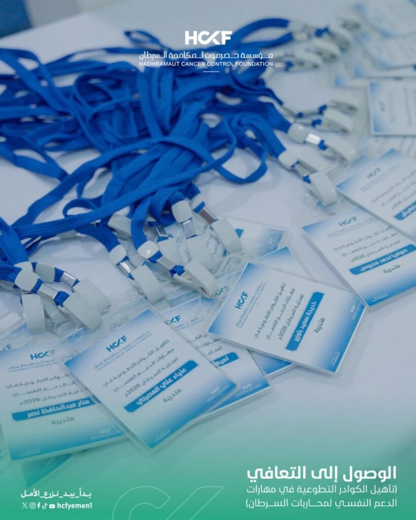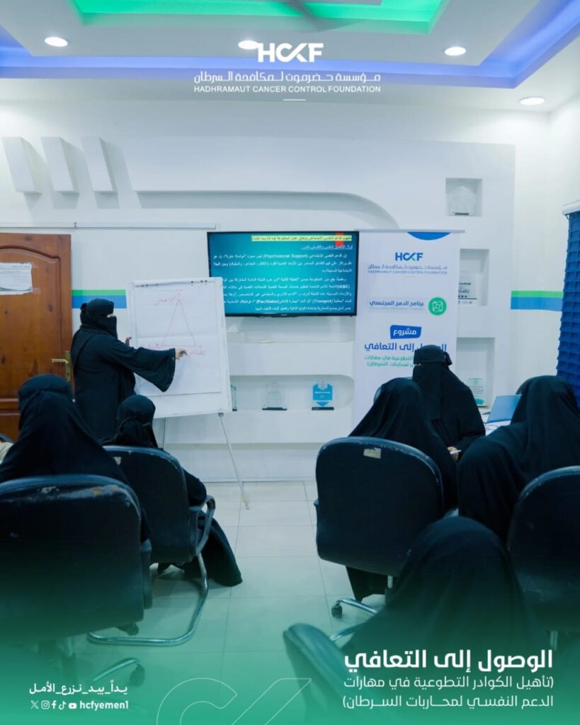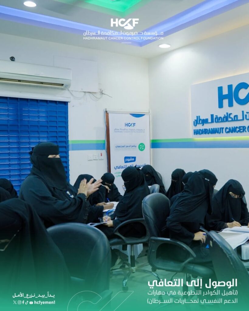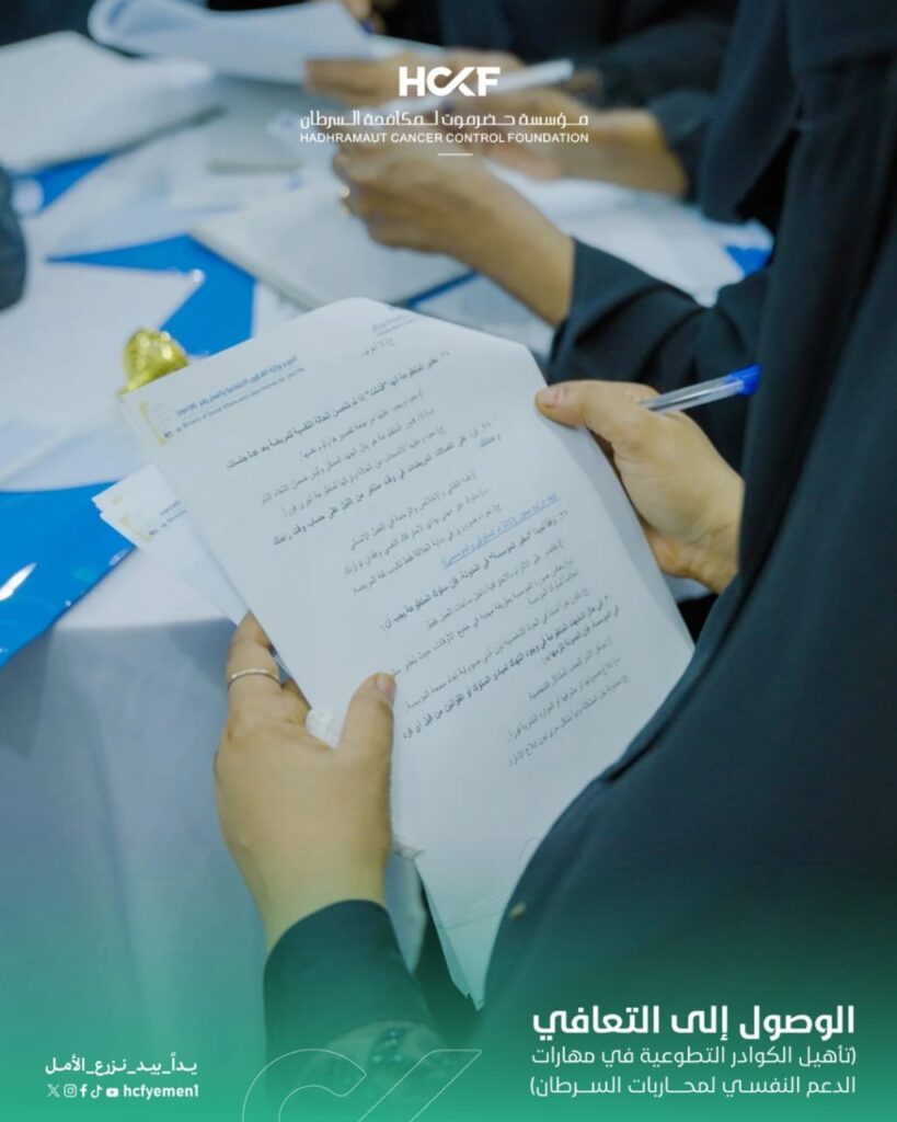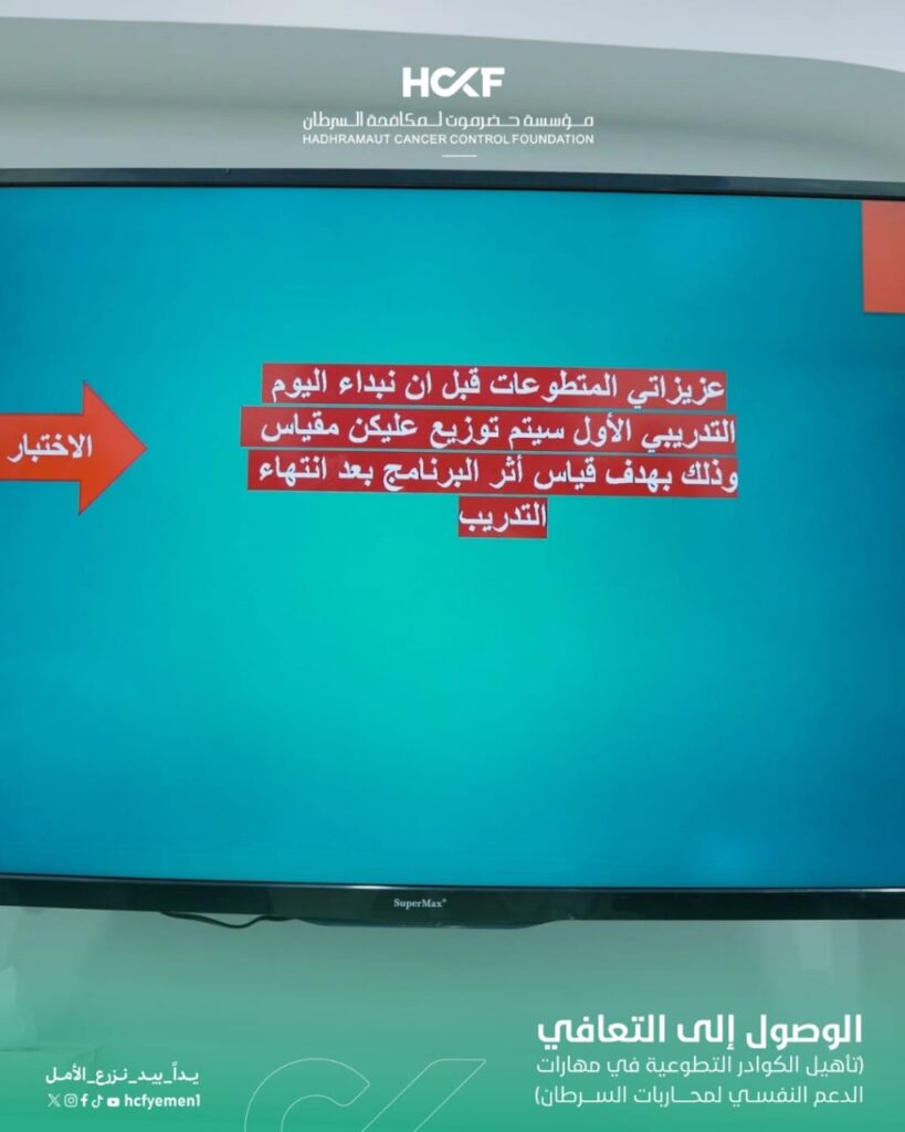 انطلاق دورة تأهيل المتطوعين في مهارات الدعم النفسي لمحاربات السرطانانطلقت مساء الإثنين 6 أبريل 2026 أعمال الدورة التدريبية الخاصة بتأهيل الكوادر التطوعية في مهارات الدعم النفسي لمحاربات السرطان، وذلك ضمن أنشطة مشروع (الوصول إلى التعافي) الذي تنفذه المؤسسة في إطار جهودها المستمرة لتعزيز جودة الرعاية الشاملة.وشهد اليوم الأول تفاعلاً مميزاً من المشاركين، حيث تم استعراض المفاهيم الأساسية للدعم النفسي وأهميته خلال رحلة العلاج، إلى جانب التعريف بدور المتطوعين في تقديم دعم إنساني فعّال يسهم في تحسين الحالة النفسية للمريضات.وتأتي هذه الدورة تأكيداً على التزام المؤسسة ببناء قدرات كوادرها التطوعية، وتعزيز دورهم في تقديم رعاية متكاملة تسهم في دعم محاربات السرطان نفسياً ومرافقتهن نحو التعافي.